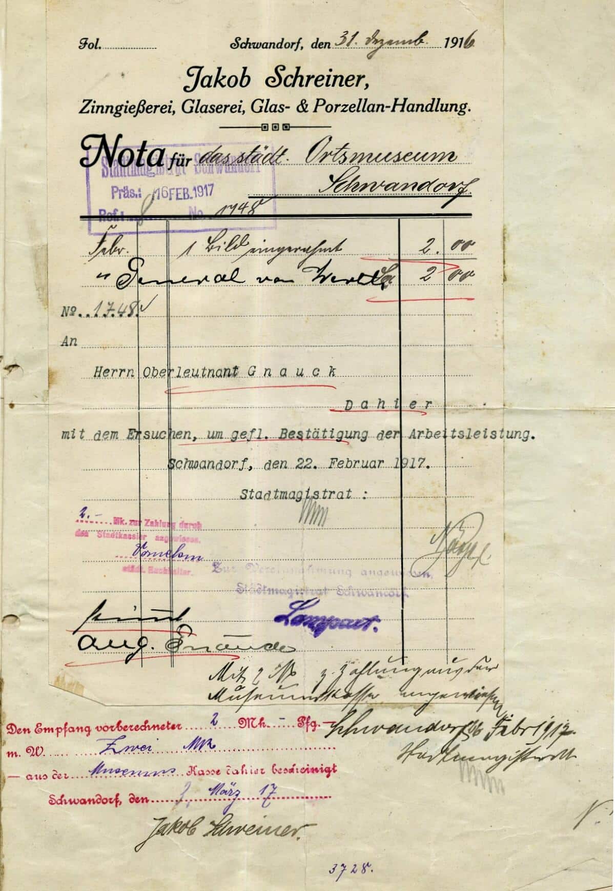 Beispiel: Für das Einrahmen des Bildes “General von Werth“ erhält die Firma Schreiner 2 Mark.