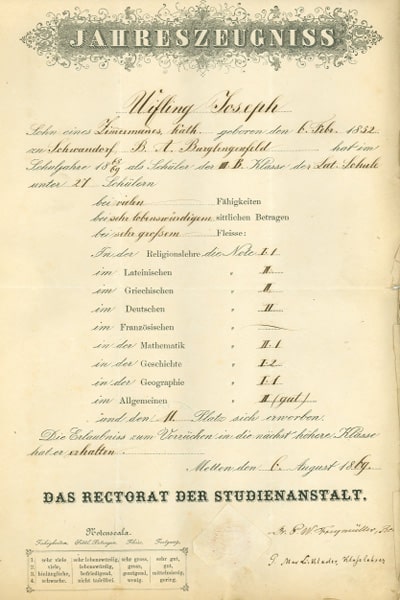 Beispiel: Jahreszeugnis des Joseph Wifling aus dem Jahre 1869
