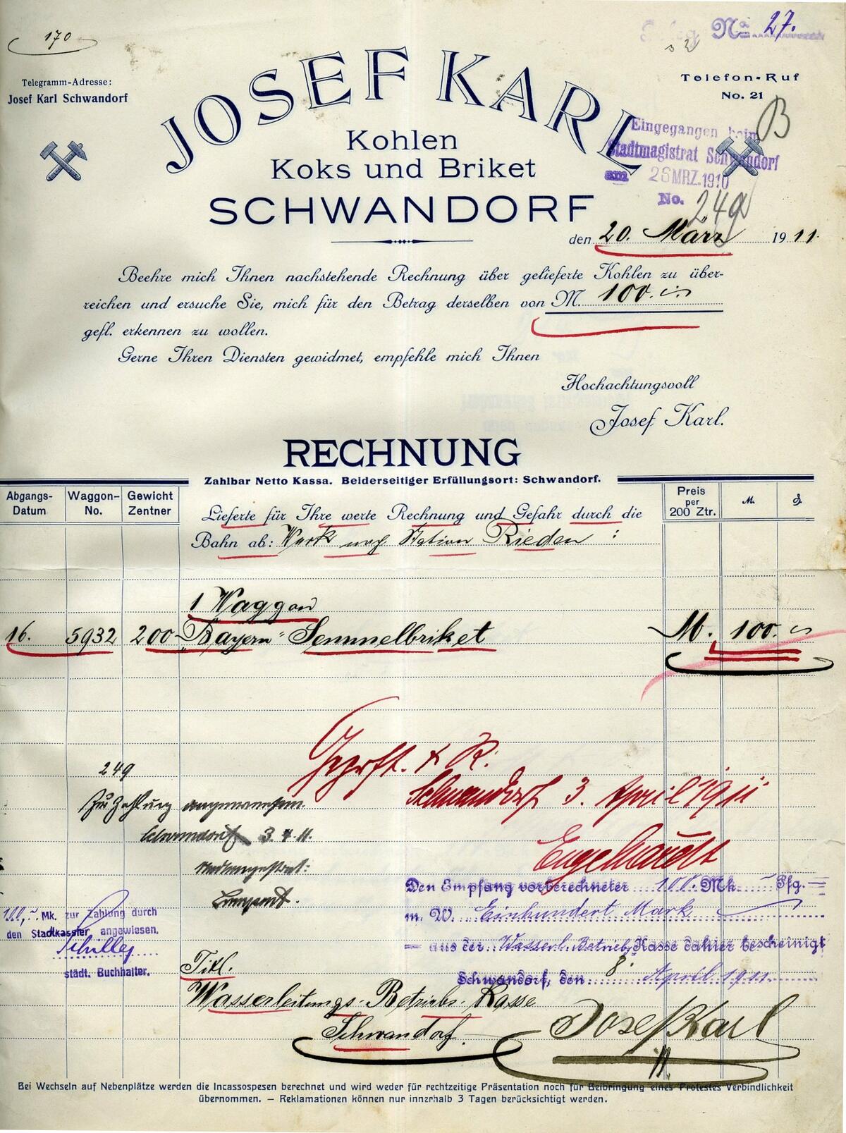 Beispiel: 200 Zentner “Bayern-Brikett“ werden im März 1911 geliefert.